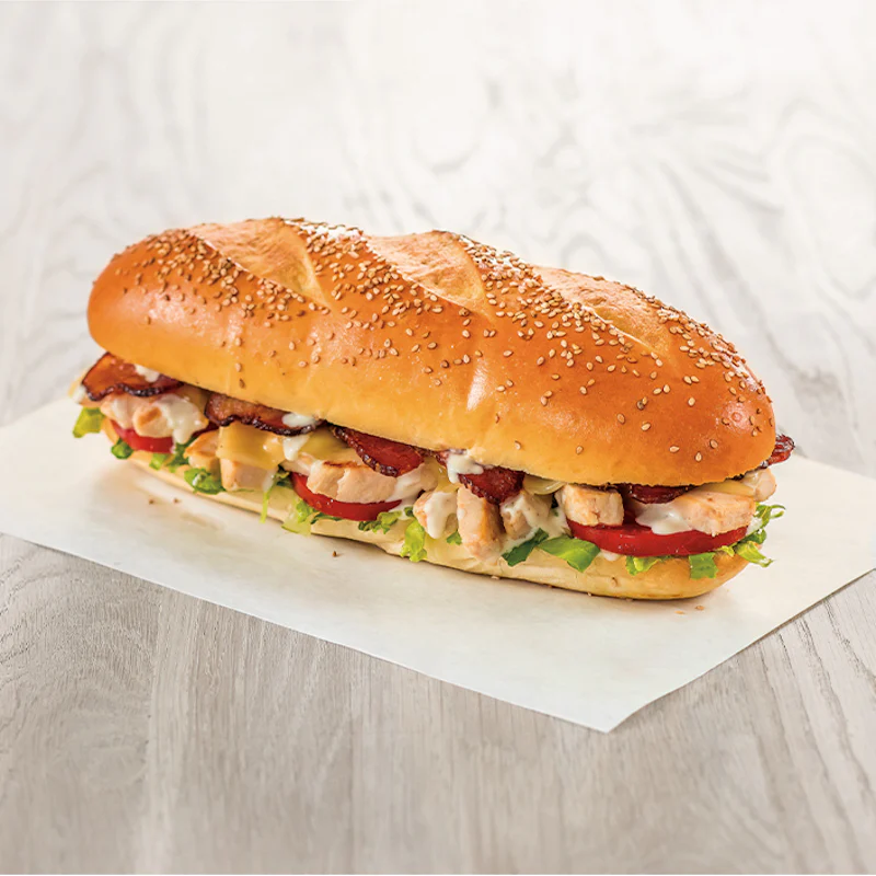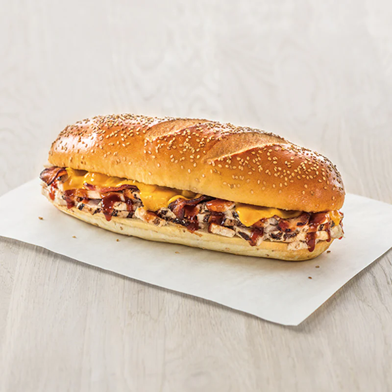 Grilled chicken and crispy bacon smothered in BBQ sauce with melted cheddar cheese on a fresh-baked sesame roll. Customize it to make it your own!