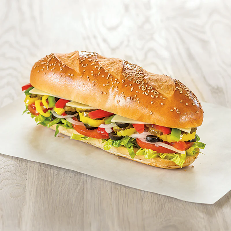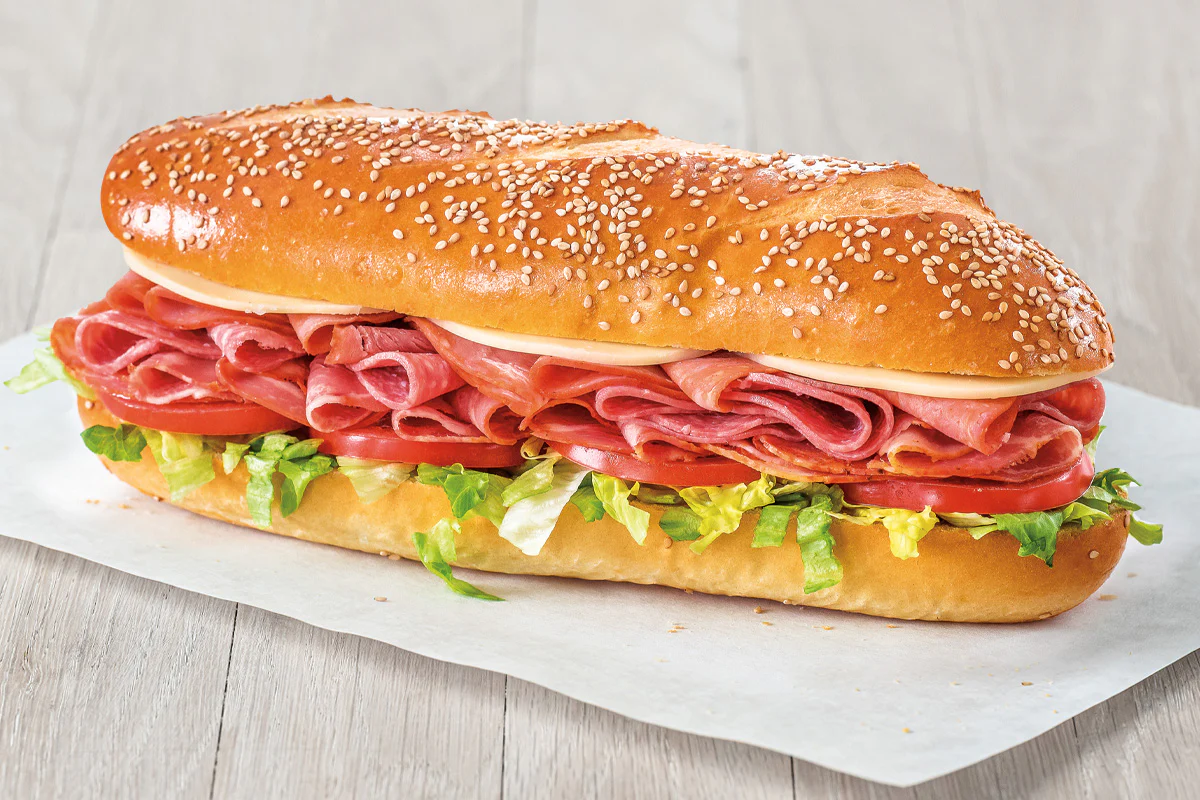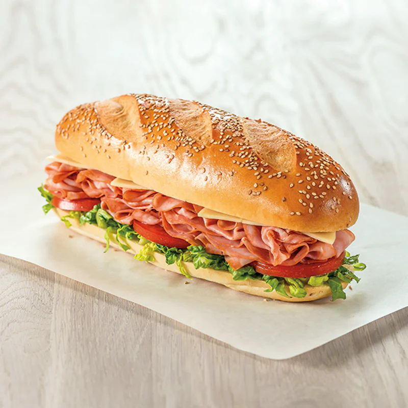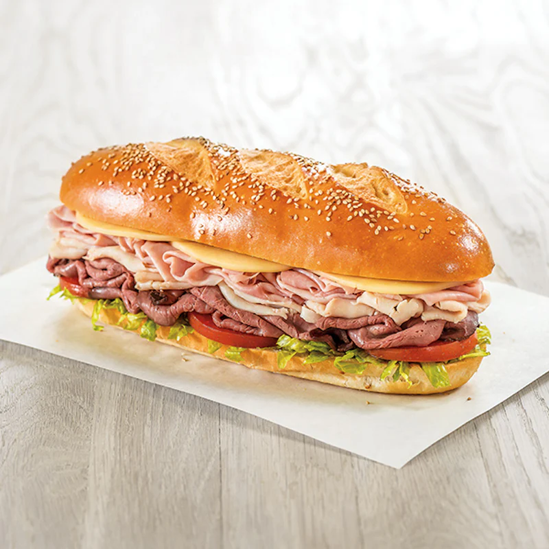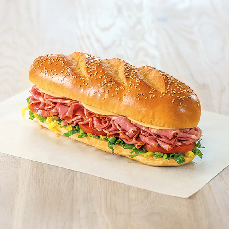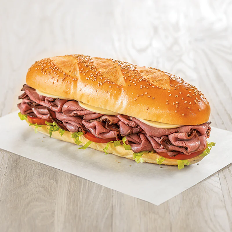 Roast beef with lettuce, tomato, onion, horseradish mayonnaise and Cheddar cheese on a fresh-baked sesame roll. Customize it to make it your own!