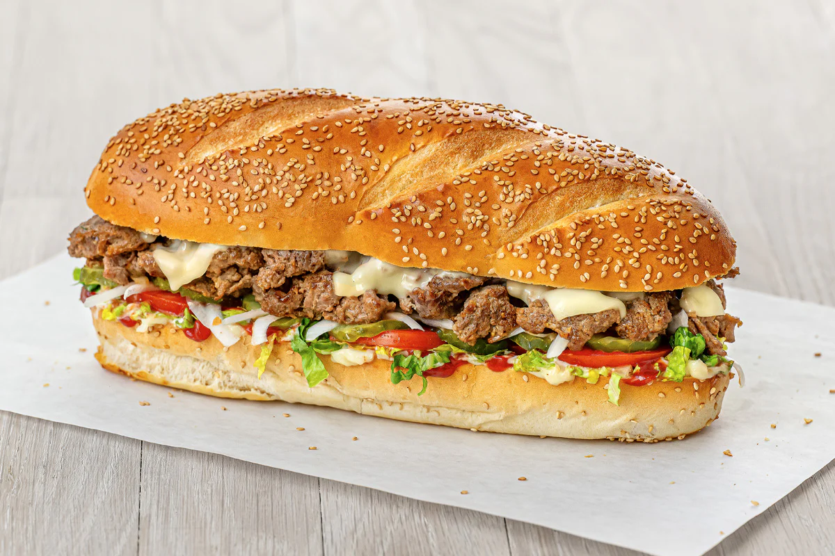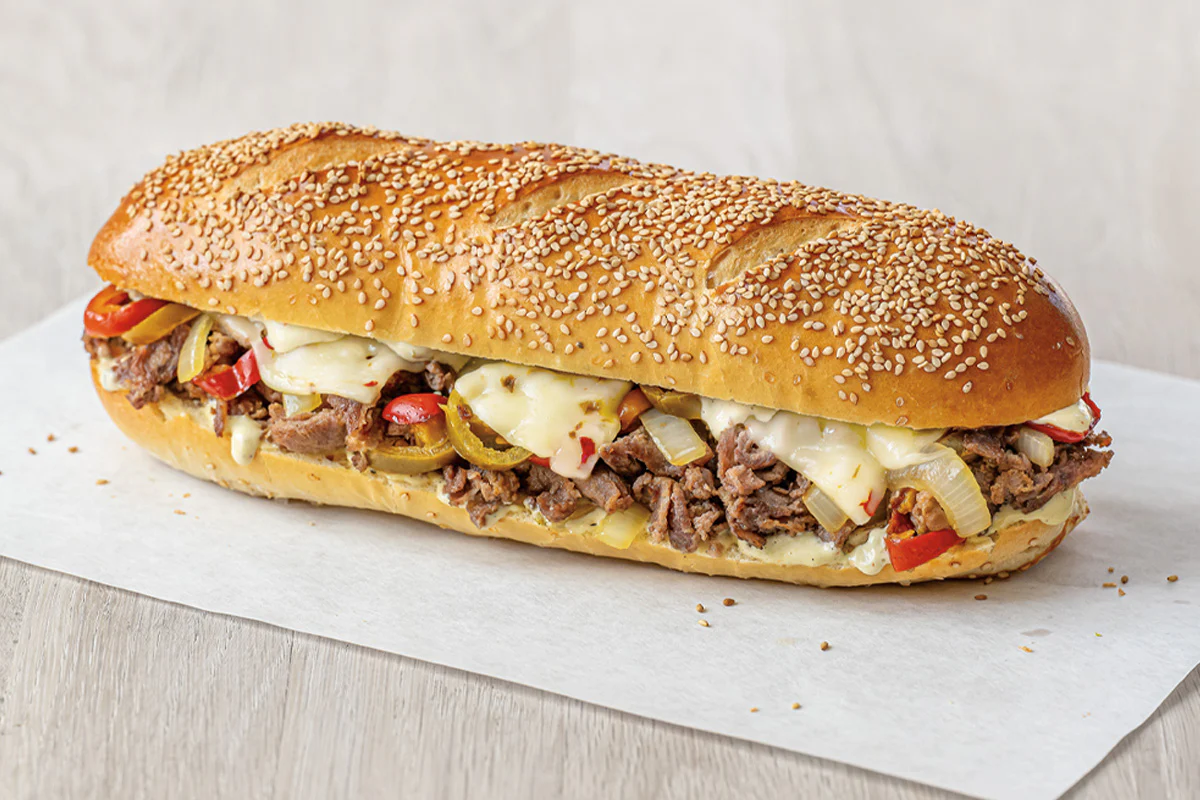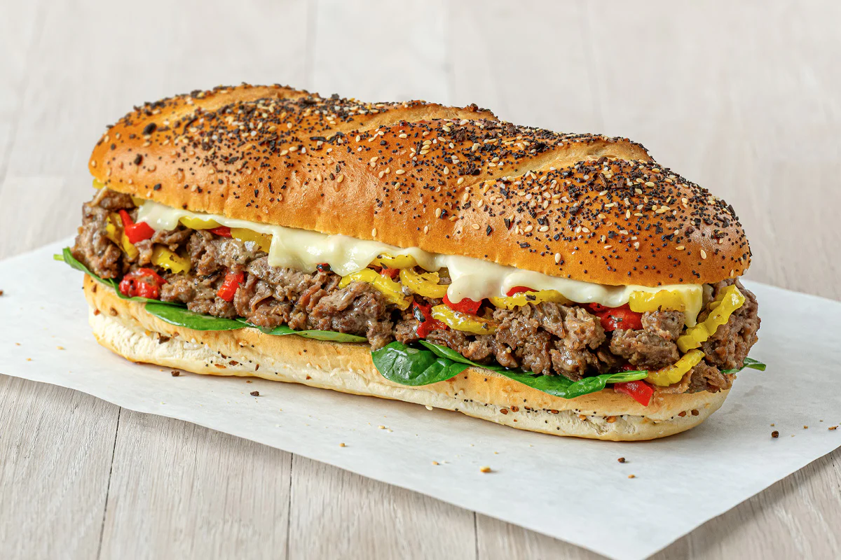 Grilled steak with grilled sweet peppers, onions, mayonnaise and American cheese on a fresh-baked sesame roll. Customize it to make it your own!
