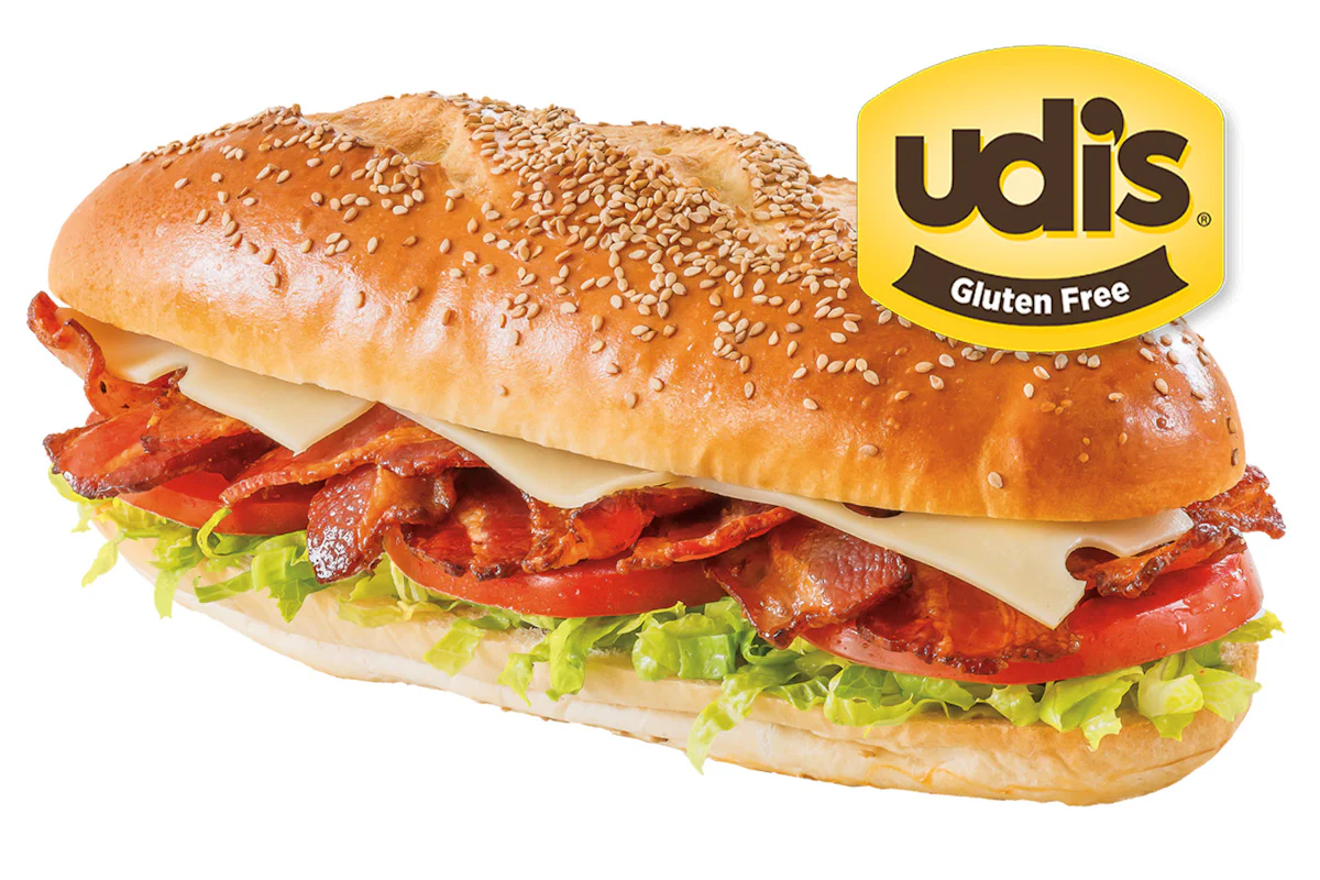 A mountain of crispy bacon with lettuce, tomato, mayonnaise and American cheese on a 10" GLUTEN FREE ROLL. Customize it to make it your own!