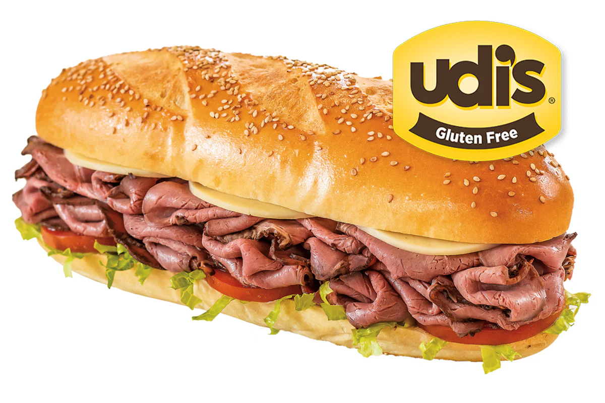 Roast beef with lettuce, tomato, onion, horseradish mayonnaise and Cheddar cheese on a 10" GLUTEN FREE ROLL. Customize it to make it your own!